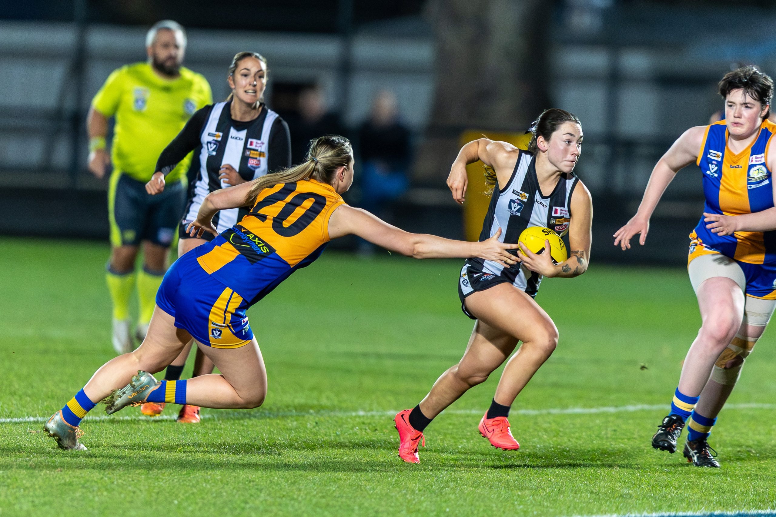 Magpie Jemma Finning shrugs a tackle and looks for an option during Friday night’s final. Photo: Peter Banko