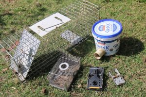 L-R: Live rat ‘box’ trap, live mouse trap, plastic rat snap trap, metal mouse snap trap. Back: home-made bait station with narrow opening.