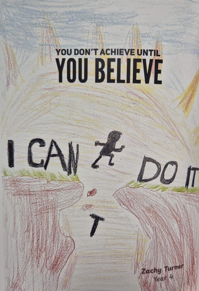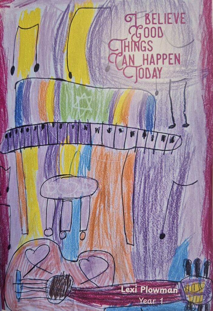 The project included class conversations about positive affirmations, and how they can be helpful, as well ideas about positive art style to suit the theme.