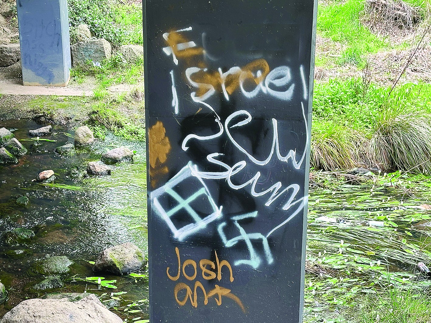 The bridge's pillars were spray painted with swastikas, cartoon drawings of faces with exaggerated noses, and statements – "f**k Israel" and "Jew scum". (image digitally edited)
