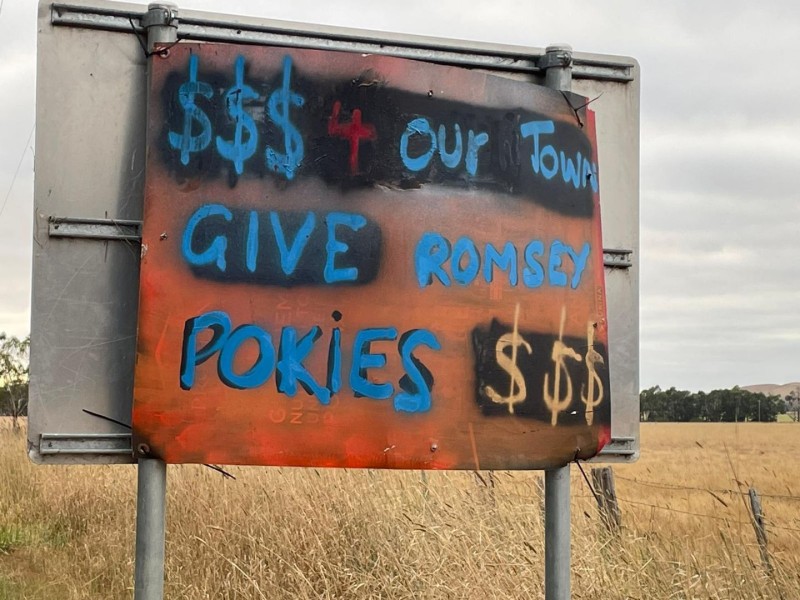 Sometime overnight last Wednesday and Thursday at least four of the signs were spray-painted with opposite messaging: ‘Give Romsey pokies $$ 4 our town’.