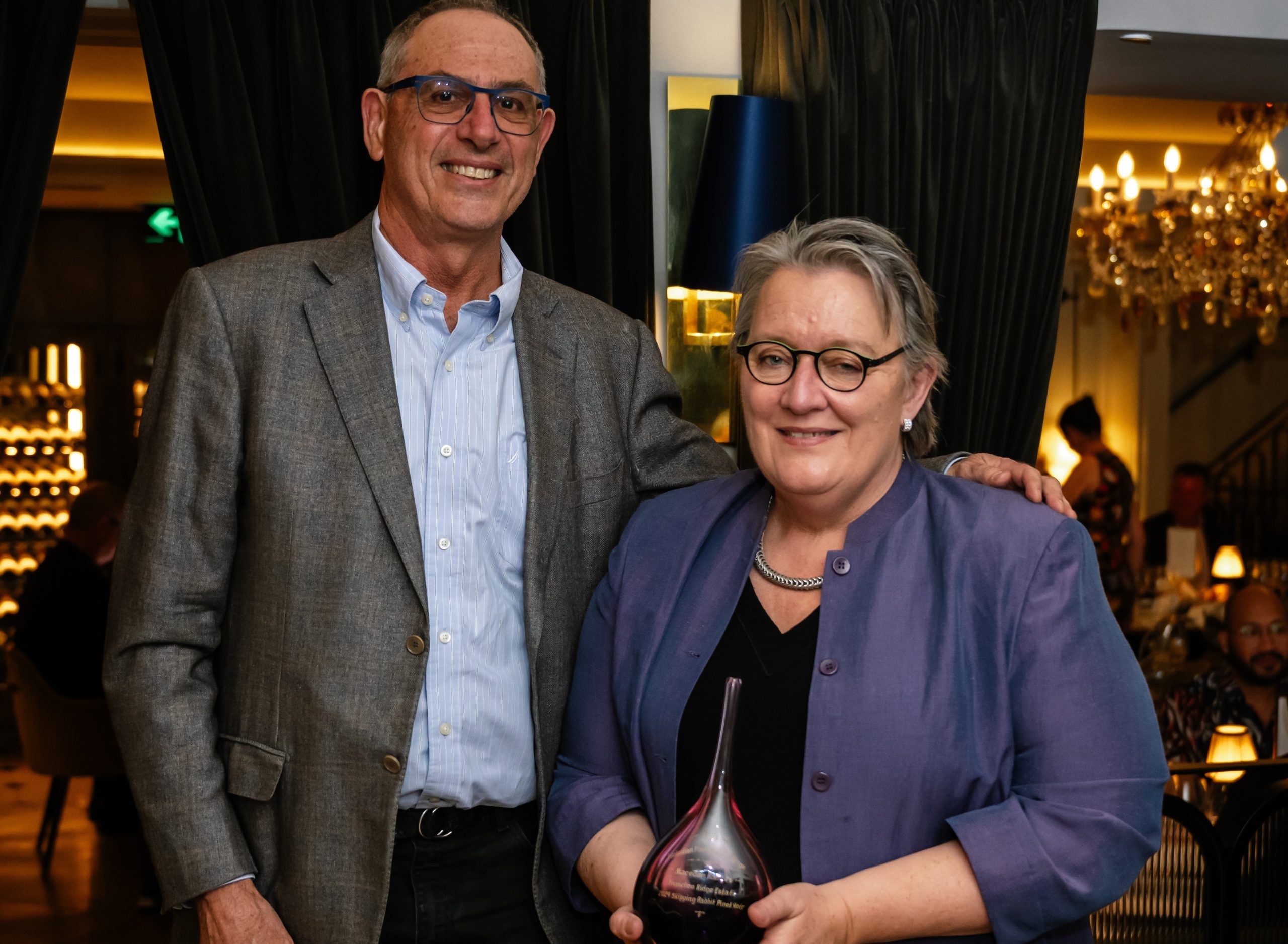 Andrew and Angela Wood, owners of Kyneton Ridge Estate, pose with their trophy at the 2025 Australian Pinot Noir Challenge awards dinner. Photo: Janis House Photography