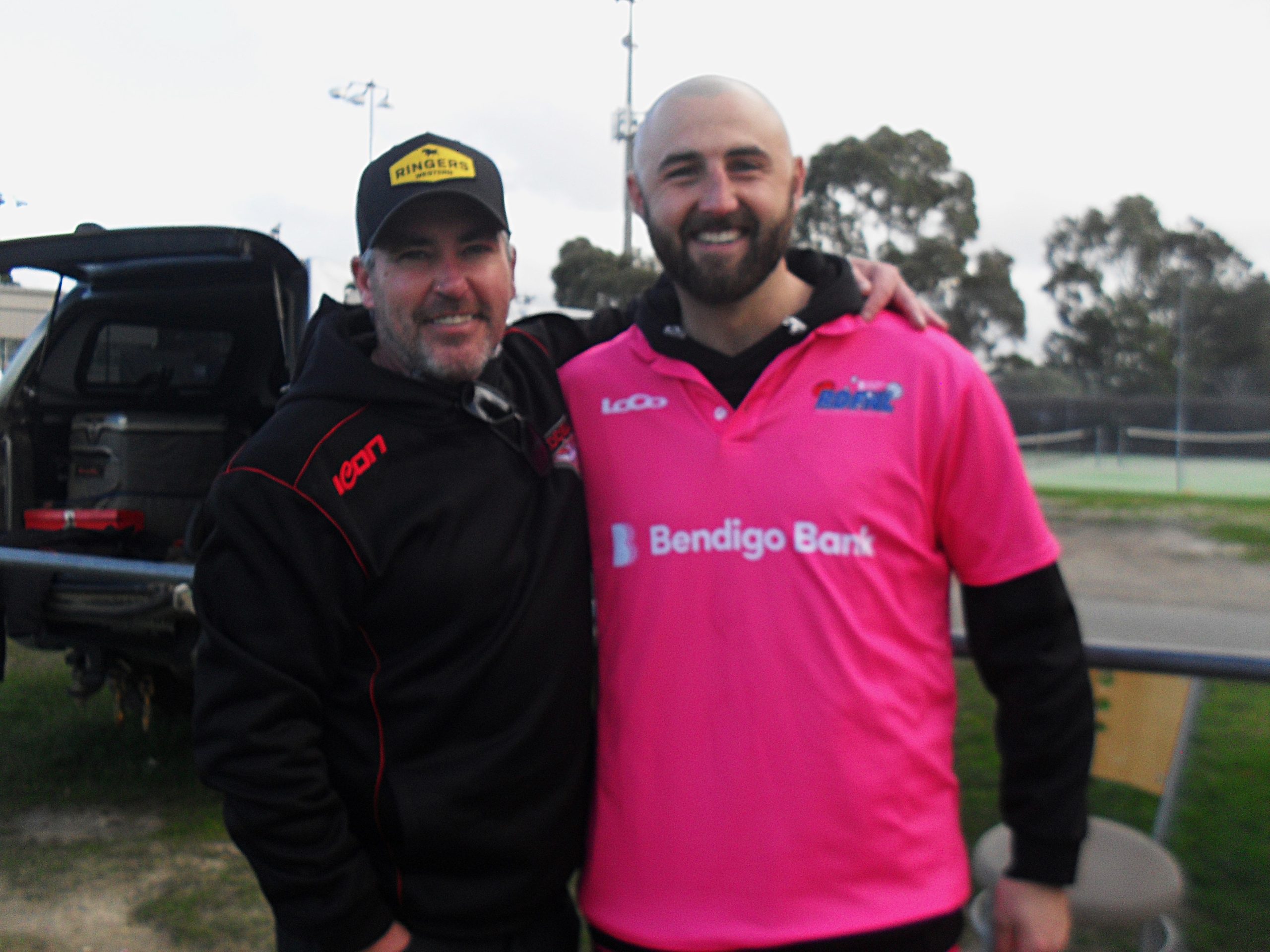 Riddell football dynamo Dylan Tarczon, pictured with assistant coach Andrew Power, was a very energetic runner in Saturday’s qualifying final. Tarczon is one the Bombers’ match winners, and he is certain he will be back to play an important role in the finals.
