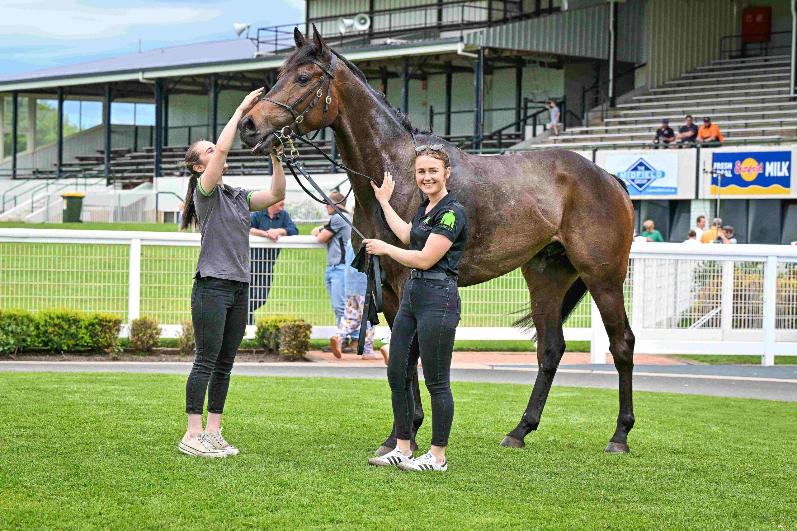 That happy feeling: Sisters Lottie (at left) and Cass Marr are part of the Howley stable team, and were thrilled with Riozino’s victory. Photo: Reg Ryan/Racing Photos